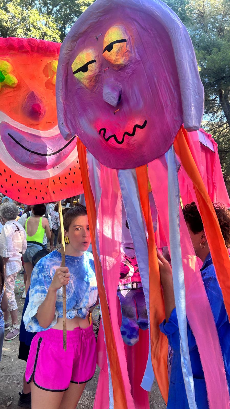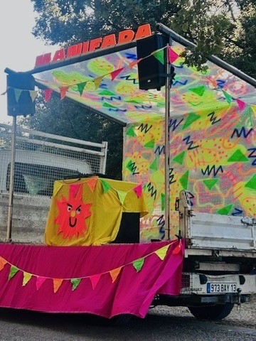 Imaginé comme un travail de mobilisation manifestive - en vue d’organiser la cérémonie d’ouverture du festival des Fadas du Monde - en juillet 2025, nous déployons un processus d’animation de territoire au fil de cinq samedis d’ateliers ouverts à toutes et tous : fabrication de banderoles, plus petite école de DJ.ette.s du monde, confection de “Mini-Fada” (des masques grimaçants en papier mâché, reflets des humeurs tempétueuses du territoire) ou encore percussions chorégraphiques. Autant de prétextes à se rencontrer, s’organiser, prendre la parole et imaginer ensemble des formes festives et revendicatives. Ici et là, nous portons en bandoulière un enjeu majeur et contagieux : faire émerger, à l’échelle des quartiers, des espaces d’expression populaires où la fête devient un outil de mobilisation et de mise en mouvement citoyen.
